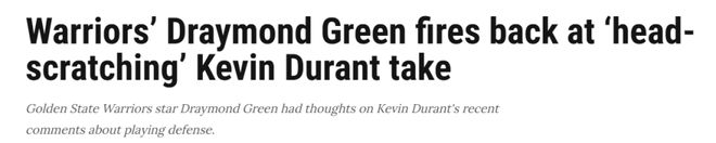 “说实话,他(杜兰特)的话有点让人费解,我当时就想‘哈?’但反过来想,也没那么费解,因为我了解凯文…… 我没看到完整语境,也知道话语可能被断章取义,但我看到了他说的内容。” 追梦补充道。